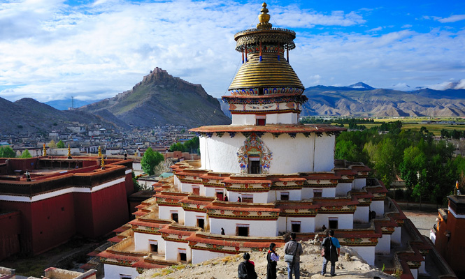 Pelkor Chöde Monastery with Gyantse Kumbum: the sprawling compound in the far north of town houses Pelkor Chöde Monastery and the monumental Gyantse Kumbum, a chörten filled with fine paintings and statues. Both are deservedly top of the list on most travellers’ must-sees. Palkhor lies at the foot of Dzong Hill. It is well-known for its Kumbum, which has 108 chapels in its four floors. The multi-storied Kumbum Stupa was crowned with a golden dome and umbrella, surrounded with more chapels filled with unique religious statues and murals. Overnight in Shigatse.